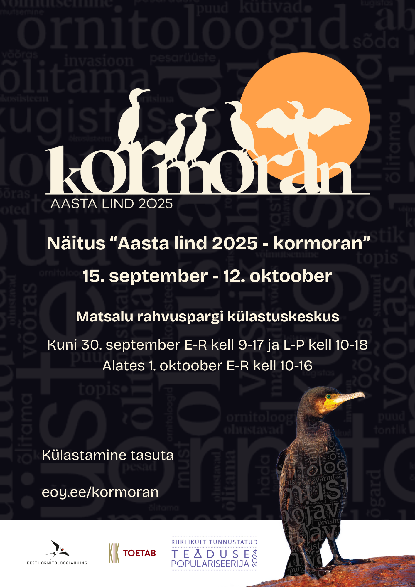 Eesti Ornitoloogiaühingu koostatud näitus keskendub tänavuseks aasta linnuks valitud kormorani rollile ökosüsteemis: milline on liigi mõju elupaikadele, aineringele, toiduahelale ja kalastikule.