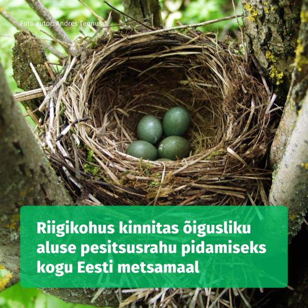Riigikohus tegi otsuse kohtuasjas, mis käsitles metsaraiete lubatavust lindude pesitsusajal ning Keskkonnaameti õigust raietöid ajutiselt peatada. Kohus leidis, et raietööde peatamiseks pesitsusajal ei ole vaja eelnevalt linde loendada ega tõendada iga konkreetse pesa olemasolu. Otsus ühtib Eesti Ornitoloogiaühingu seisukohaga, et pesitsusrahu ei ole soovituslik meede, vaid õiguslikult põhjendatud ja teaduspõhine vajadus, mis peab kehtima kõigis Eesti metsades.