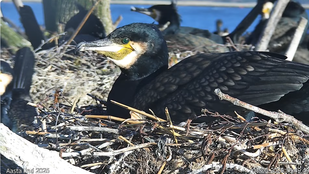 Kuna kormoranid võtavad pesaehitamist üsna tõsiselt, siis tabas kaamerasilm ka kohati koomiliseks kujunenud dispuute sobivate materjalide pärast – kord jõudis üks oksaraag viis korda omanikku vahetada, enne kui viimaks kaamera vaateväljast kadus. Kui pulmatantsud tantsitud ja pesad piisavalt kapitaalsed, siis saime mai algul olla tunnistajateks esimeste kormoranitibude koorumisele.