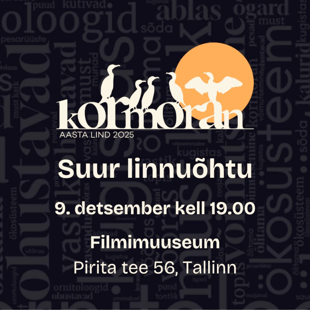 Homme paneb Eesti ornitoloogiaühing suure linnuõhtuga punkti kormorani aastale. Tallinnas filmimuuseumis toimuval linnuõhtul räägime 2025 aasta linnust, arutleme kormorani rolli üle ning naudime muusikalisi vahepalasid.