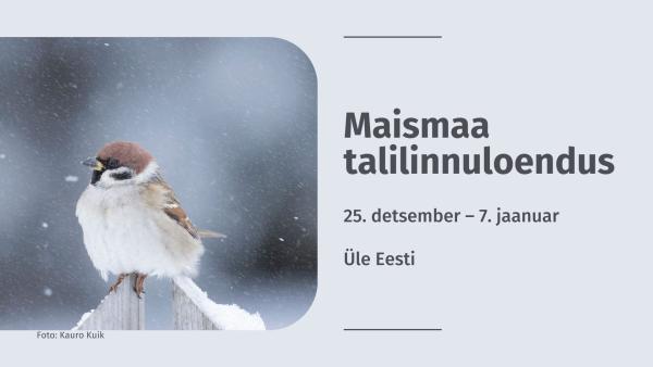 Eesti Ornitoloogiaühing ootab linnuhuvilisi osalema maismaa talilinnuloendusel, et koguda andmeid meil talve veetvate lindude käekäigu kohta. Teine periood algab esimesel jõulupühal 25. detsembril ja kestab 7. jaanuarini.