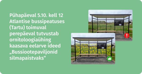 Pühapäeval, 5. oktoobril kell 12 algaval perepäeval Tartus Atlantise bussipeatuse juures räägivad Eesti Ornitoloogiaühingu töötajad rändlindudest ja klaaspindadest ning tutvustavad kaasava eelarve ideed number 3 “Bussiootepaviljonid silmapaistvaks”.