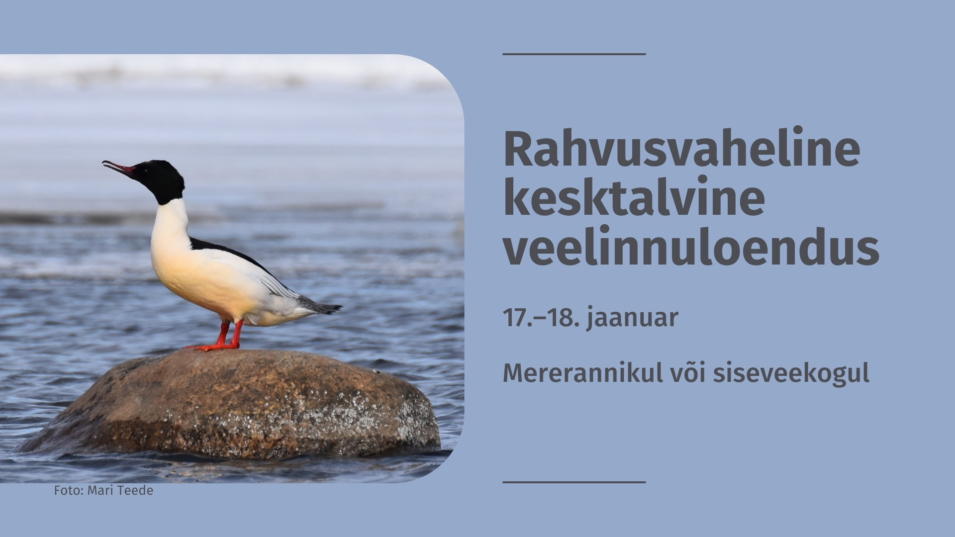 Lisateave: Leho LuigujoeKesktalvise veelinnuloenduse koordinaator Tel 507 9713 leho.luigujoe@gmail.comwww.eoy.ee