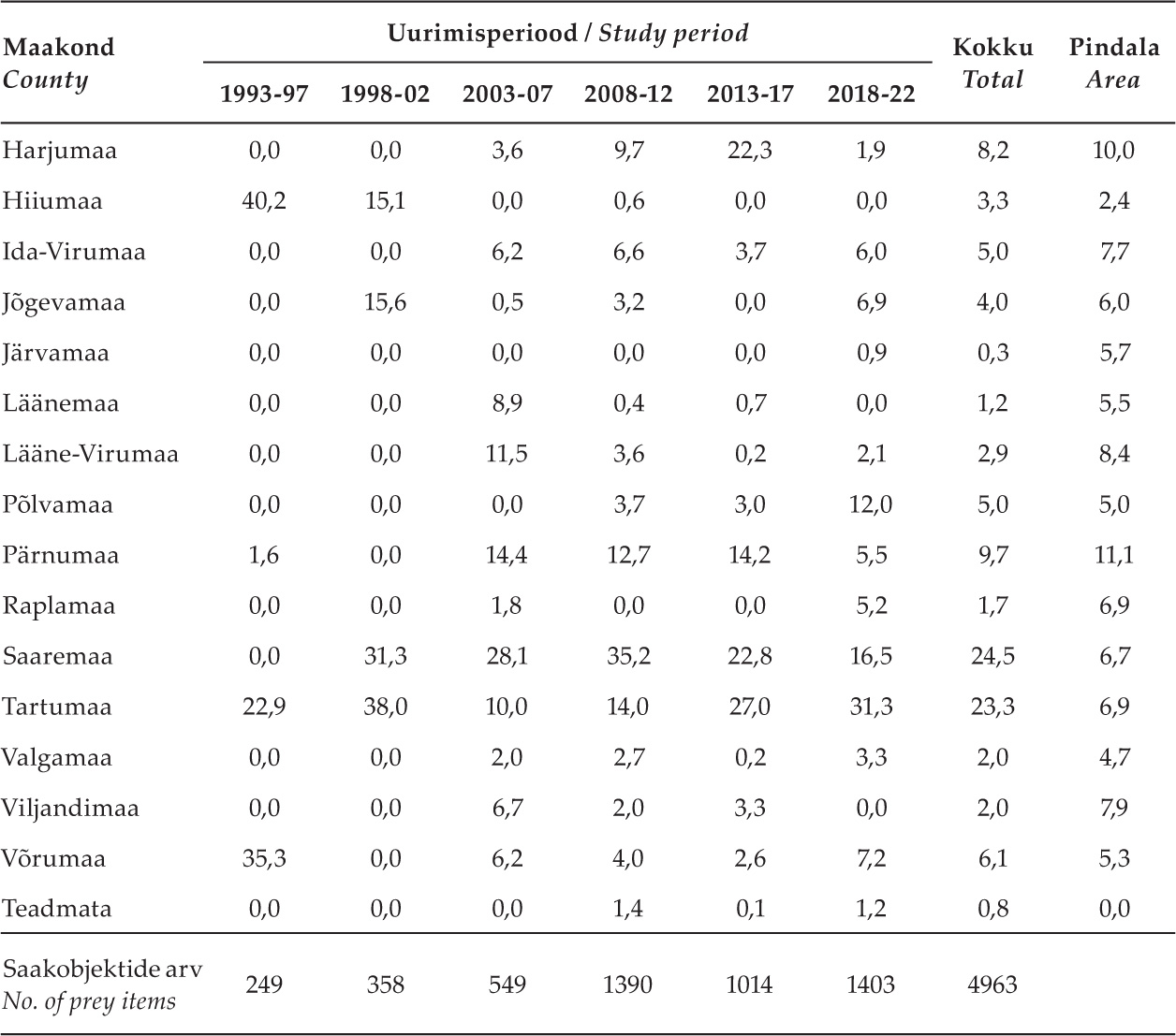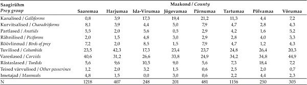 Table 1. Percentages of collected prey animals (by number) in Estonian counties by study period and in total during the entire research period. The percentage of the land area of each county in Estonia (45,228 km2; before the 2017 administrative reform) is also presented.