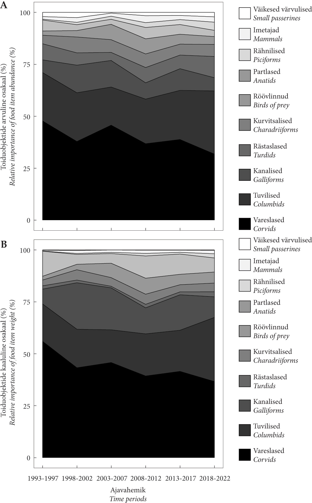 Figure 1. Changes in the goshawk’s prey composition in Estonia 1993–2022, evaluated by the number (A) and mass (B) of prey animals. The exact values of the proportions of the periods are presented in Appendix 2.
