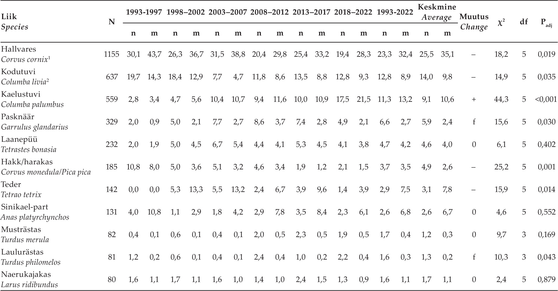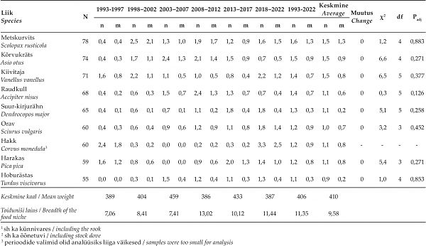 Tabel 2. Olulisemate saakloomade (üle 50 isendi) osatähtsuste, saakloomade keskmise kaalu ning toiduniši laiuse muutused 1993–2022. Iga saakobjekti puhul on esitatud isendite arv koguvalimis (N) ning protsentuaalsed osatähtsused arvu (n) ja kaalu (m) järgi, mis on arvutatud kõigi saakobjektide põhjal (vt lisa 1). Muutuste (+: tõus, –: langus, 0: stabiilne, f: fluktueeruv) olulisust hinnati χ2- testiga, esitatud on statistiku väärtus (χ2), vabadusastmete arv (df) ja korrigeeritud olulisuse tõenäosus (Padj).