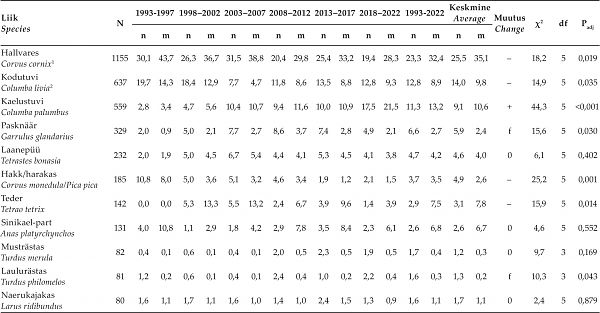 Arvulistest muutustest (joonis 1A, lisa 2) oli silmatorkavaim vareslaste osatähtsuse oluline kahanemine viimase kolmekümne aasta vältel (χ2 = 13,3; P= 0,041). Seejuures muutusid oluliselt nii hallvarese, pasknääri kui hakkide-harakate osatähtsused (tabel 2). Tuviliste (χ2 = 17,4; Padj = 0,012) osatähtsus kasvas viimasel perioodil. Kõigi perioodide lõikes oli märkimisväärne kaelustuvi Columba palumbus tõus, kuid samas langes kodutuvi osa (tabel 2). Ka rästaslaste osa kasvas viimasel perioodil (χ2 = 13,8; P= 0,043). Rähniliste osatähtsus tõusis ühtlaselt kogu uuringu vältel (χ2 = 11,2; P= 0,040; kahe esimese ajaperioodi väikesed valimid liideti), seejuures kasvasid nii suur-kirjurähni kui musträhni proportsioonid, ehkki need tõusud olid statistiliselt mitteolulised (tabel 2, lisa 2). Kanaliste (χ2 = 15,8; P = 0,037) ning röövlindude (χ2 = 15,8; P= 0,075) kõrgeimad osatähsused jäid keskmistele uurimisperioodidele, kuid näiteks tedre puhul võis näha pikaajalist olulist langust (tabel 2). Kurvitsaliste osatähtsuses muutust ei ilmnenud (χ2 = 2,6; P= 0,764).