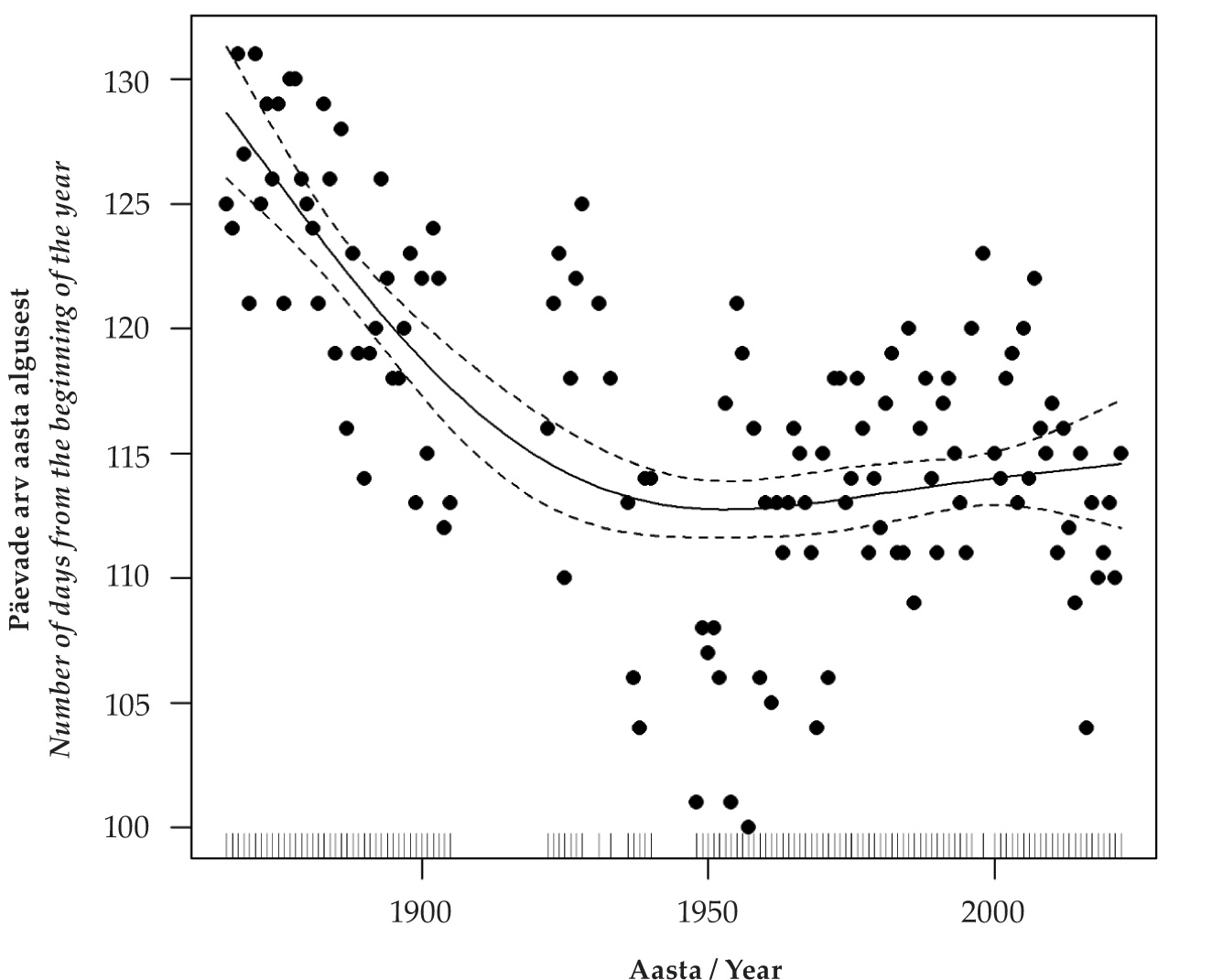 Joonis 2. Käo (Cuculus canorus) saabumisaeg (varaseim kuupäev = päevi aasta algusest, Y-telg) Eestisse aastatel 1865–2022. Pidev joon on mudeli siluja, katkendjooned 95% usaldusintervall.