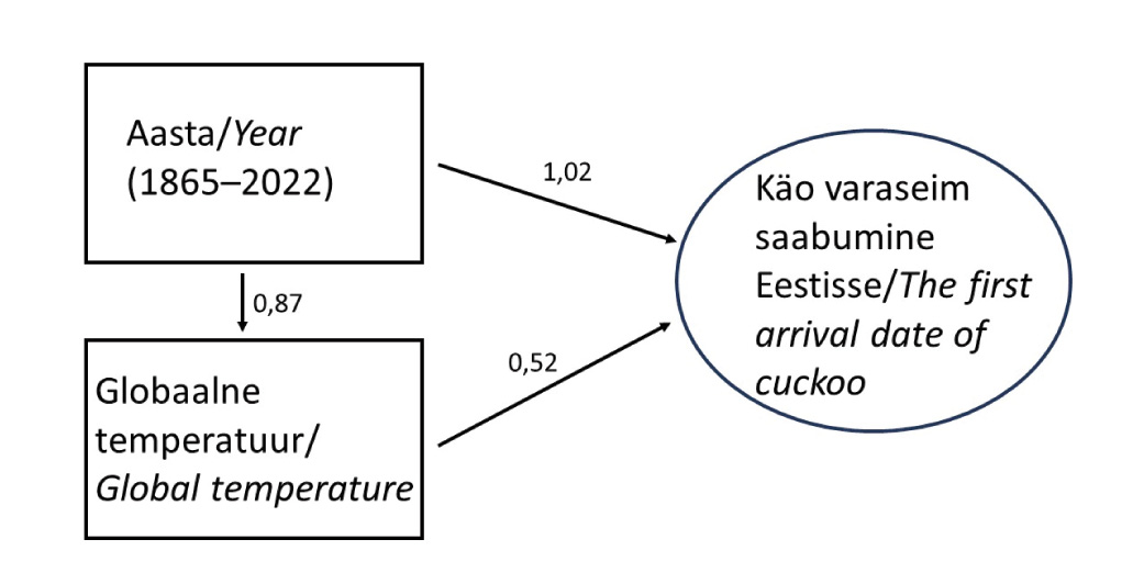 The article gives an overview of the changes in the first arrival dates of the cuckoo (Cuculus canorus) in Estonia over the last 157 years (1865–2022). For the analysis, we used a structural equation model, which concurrently included the effects of year and global average temperature change. Based on the results, we found that the arrival time of the cuckoo in Estonia was statistically significantly related to both the year and the global average temperature, which has shown a significant increase during the research period. According to our study, the arrival of cuckoos in Estonia today is approximately two weeks earlier compared to the beginning of the study period. In the future studies, it would be worthwhile to investigate the first arrival date of the cuckoo in conjunction with the arrival of the main host species to explain the arrival phenology even more precisely.