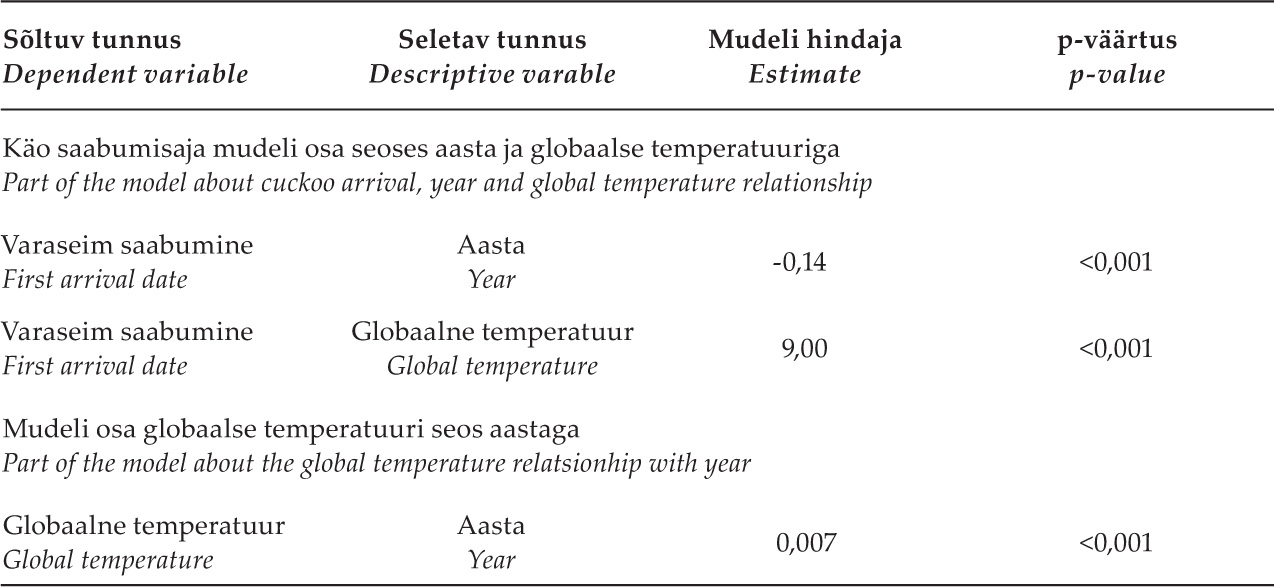 Tabel 1. Struktuurivõrrandite mudeli tulemused. Mudeli esimene osa hindas käo saabumisaja sõltuvust aastast ja maakera globaalsest temperatuurist. Mudeli teine osa hindas globaalse temperatuuri enda seost aasta mõjuga.